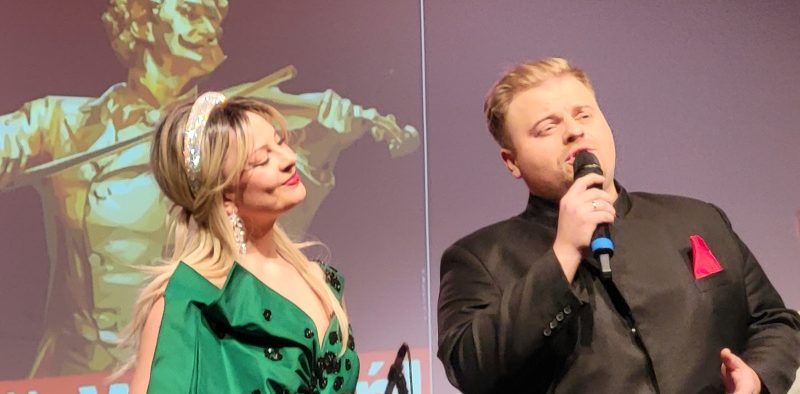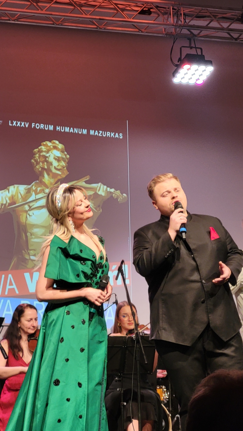 Viva Wiedeń! Viva Broadway! – chyba nie ma lepszego tytułu na wieczór w karnawałowym nastroju. A właśnie na taki koncert zaprosili do Ożarowa Mazowieckiego prezesi Grupy Mazurkas: Andrzej Bartkowski i Andrzej Hulewicz. To miejsce o przysłowiowy rzut beretem od Warszawy: w eleganckiej sali MCC Mazurkas Conference Centre & Hotel przez ponad dwie godziny soliści polskiej i europejskiej sceny operowej i operetkowej przenosili publiczność do magicznego Wiednia i pełnego energii Nowego Jorku, wykonując słynne arie, duety, walce i polki Johanna Straussa, Franca Lehara, Imre Kalmana; szlagiery musicalowe, filmowe, przeboje światowe. Widzowie bawili się tak doskonale, że zachęceni do wspólnego śpiewania nie dali się długo namawiać. Nad całością koncertu czuwał i żartobliwie wprowadzał w klimat poszczególnych utworów dyrygent: Maestro Woytek Mrozek. Klarnecista, aranżer, kompozytor, instrumentalista kształcił się w akademiach muzycznych w Warszawie i Monachium, rozwijał talent zdobywając nagrody w konkursach i współpracując z takimi artystami z kręgu klasyki i jazzu jak Krzysztof Herdzin, Krzesimir Dębski, Konstanty Andrzej Kulka, Nigel Kennedy, Zbigniew Namysłowski, Andrzej Jagodziński, Ewa Bem oraz z licznymi zespołami. Maestro słynie z dowcipu, oryginalnych pomysłów, a występy podczas jubileuszowej 85. edycji Forum Humanum Mazurkas prowadził lekko, zabawnie i żywiołowo. Na scenie pojawili się znakomici soliści: Barbara Gutaj (sopran), Agata Sava (mezzosopran), Nazar Tatsyshyn (tenor). Entuzjazm wywołał utalentowany wirtuoz skrzypiec Marjan Lomaha, który ostatnie trzy lata spędził w Japonii, koncertując we wszystkich salach na terenie całego kraju! Komplementy na temat jego mistrzowskiej gry nie są przesadzone. Publiczność miała też okazję podziwiać wystawy Anny Foryckiej-Putiatyckiej, która udostępniła tym razem na ekspozycję liczne prace pod tytułem „Symfonia z nutką barw”. Tak więc malarstwo i muzyka przenikają się nawzajem i inspirują. Artystka jest założycielką Grupy Twórczej SYMFONIA Okręgu Warszawskiego Związku Polskich Artystów Plastyków, którzy chętnie podejmują w swojej sztuce – malarstwie, rzeźbach, medalierstwie – tematy muzyczne. Wielokrotnie wystawiała swoje obrazy w kraju i zagranicą, a teraz wybrała te jednoznacznie wiążące się z motywami wieczoru: w inspiracjach, kompozycji i kolorystyce. Sugestie odczytania intencji autorki prac znajdujemy już w tytułach: „Dixieland”, „Taniec szamana”, „Balet współczesny”, „Niebieskie rytmy”, „Róża tonów”, „Taneczny rozsyp”, „Muzyka kolorów”. Przez obrazy przesuwają się mazury, sonaty i polonezy; brzmi muzyka Chopina, Paderewskiego i Kolberga przeniesiona na płótno. To obrazy bardzo ekspresyjne, barwne, tętniące rytmem i ruchem. Śmiałe pociągnięcia pędzlem rysują z rozmachem linie i przenikające się barwy: odcienie czerwieni, żółci i błękitu. Przywołują na myśl ślady tancerzy i nuty utworów, układające się fantazyjnie w melodię. U Kolberga jest to żywiołowa przyśpiewka ludowa, a może oberek; u Chopina – elegancka, płynna kompozycja, a u Paderewskiego – stonowana, patriotyczna nuta. Temat podsumowuje obraz zatytułowany „Radość tworzenia” – i jest to kwintesencja pracy artystycznej.