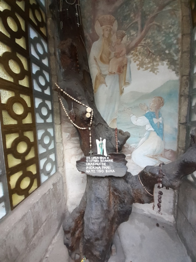 Wnętrze Kaplicy Objawień z resztką pnia uschniętego buka, nad którym ukazywała się dziewczynkom Matka Boża. Fot. z archiwum autorów.