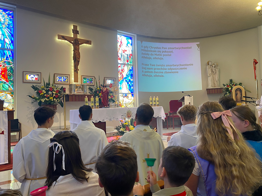 Procesja rezurekcyjna rozpoczęła się o 9.30. Wzięli w niej czynny udział licznie zgromadzenie wierni. Szczególnie odnotować należy udział dzieci i młodzieży, harcerek i harcerzy, przedstawicieli grup duszpasterskich. Po procesji rozpoczęła się koncelebrowana Msza św. Liturgii przewodniczył ks. Mariusz Han SJ, a współcelebransami byli ks. Tadeusz Rostworowski SJ, ks. Tomasz Szymczyk SJ i ks. Krystian Sowa SJ. Podczas homilii ks. Mariusz nawiązał do postawy apostołów rozczarowanych śmiercią swojego Mistrza na krzyżu. Nie takiego oczekiwali rozwiązania. Uważali, że Chrystus powinien zwyciężyć „politycznie”. „A myśmy się spodziewali …”. W tym kontekście ks. Mariusz podkreślił, że często w naszym życiu spodziewamy się, że nasze sprawy potoczą się zgodnie z naszymi wyobrażeniami. Tymczasem Pan Bóg zsyła nam inne rozwiązania, często wyglądające na „przegraną”.