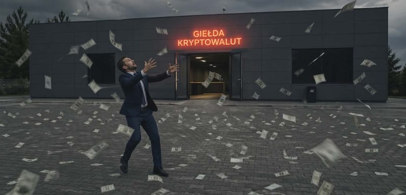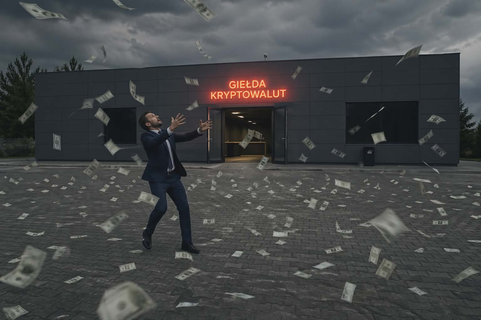 Fot. AI ChatGTP: Realistyczna fotografia: parterowy budynek biurowy, szerokie drzwi są otwarte, nad drzwiami czytelny napis – neon: GIEŁDA KRYPTOWALUT. Przed budynkiem pusty plac, na którym jest tylko jeden mężczyzna w garniturze. Mężczyzna łapie banknoty, unoszące się w powietrzu na silnym wietrze. Tych banknotów unosi się bardzo dużo na całym placu.