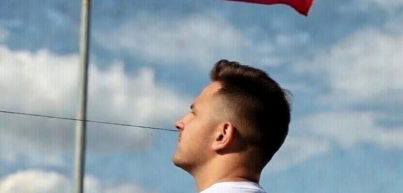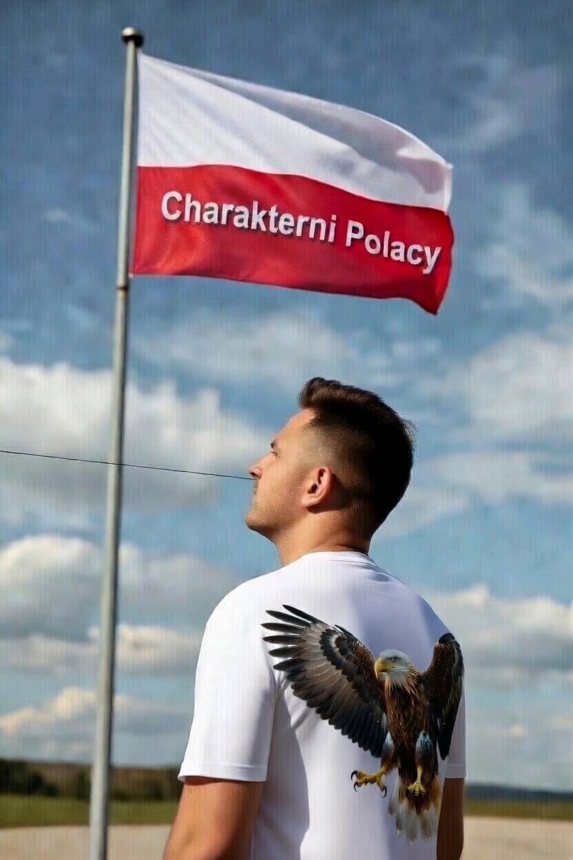 Fot. AI Grok: fotografia mężczyzny w koszulce z ptakiem, orłem na plecach i flagą z napisem Charakterni Polacy
