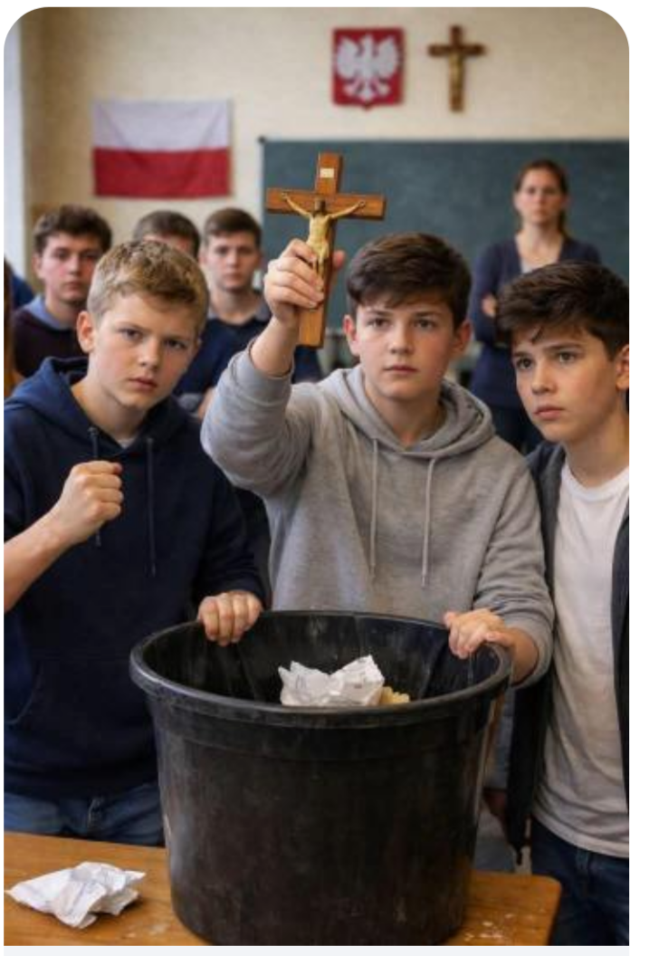 W internecie krąży zdjęcie, które skopiowałem i zaczyna ten tekst. Obejrzało je kilkadziesiąt, a może nawet kilkaset tysięcy osób. Chłopcy wyciągnęli z kosza na śmieci krucyfiks z ukrzyżowanym Chrystusem. Jeden z nich podnosi go do góry. Chłopcy są poważni. Jeden z nich nawet zaciska pięść. Z tyłu nieostry wizerunek nauczycielki. W tle klasa. Na ścianie białoczerwona flaga, godło i inny krucyfiks. Fotografia jest oszustwem wyprodukowanym przez sztuczną inteligencję. To nie są uczniowie z Kielna, nie ta klasa. I nie krucyfiks (czyli krzyż z Chrystusem), trafił w szkole do kosza, ale prosty krzyż.
